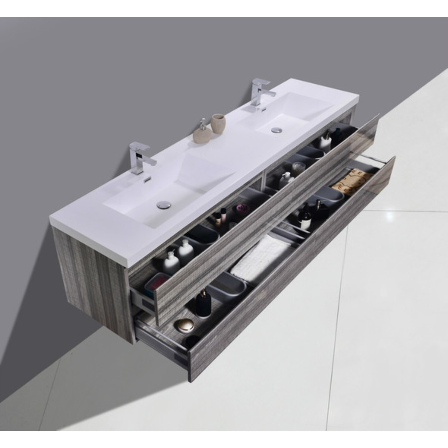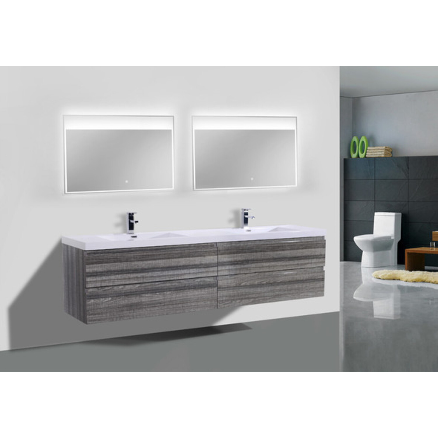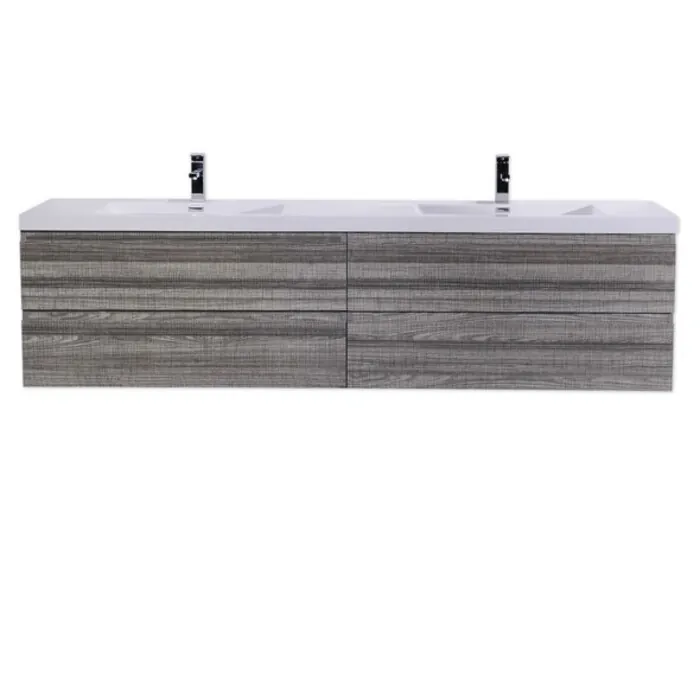 The Moreno is one of the most elegant modern Bathroom Vanities around. This 84" model comes with a reinforced Acrylic sink, Marine Veneer Constructed Console that is fully moister and water proof, with high quality European DTC Hardware, that provides smooth soft-closing operation drawers.