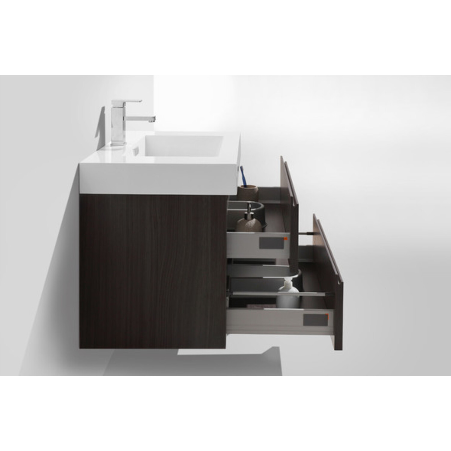 The Moreno is one of the most elegant modern Bathroom Vanities around.  This 24" model comes with a reinforced Acrylic sink, Marine Veneer Constructed Console that is fully moister and water proof, with high quality European DTC Hardware, that provides smooth soft-closing operation drawers.