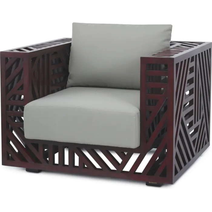 A masterpiece of woodworking, a complex yet simple and geometric piece of furniture, the Ari Chair is truly a “knockout.” Constructed from innumerable pieces of wood and given a silky patina, the chair is available in either natural or with a rich, deep reddish-brown patina. A seat and back cushion in taupe cotton come with the chair. Made in the Philippines by expert craftsmen, Ari will be the focal point of any room.
