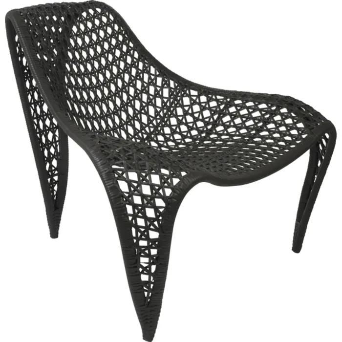 Woven leather is wrapped around an unusually shaped chair for style and comfort.