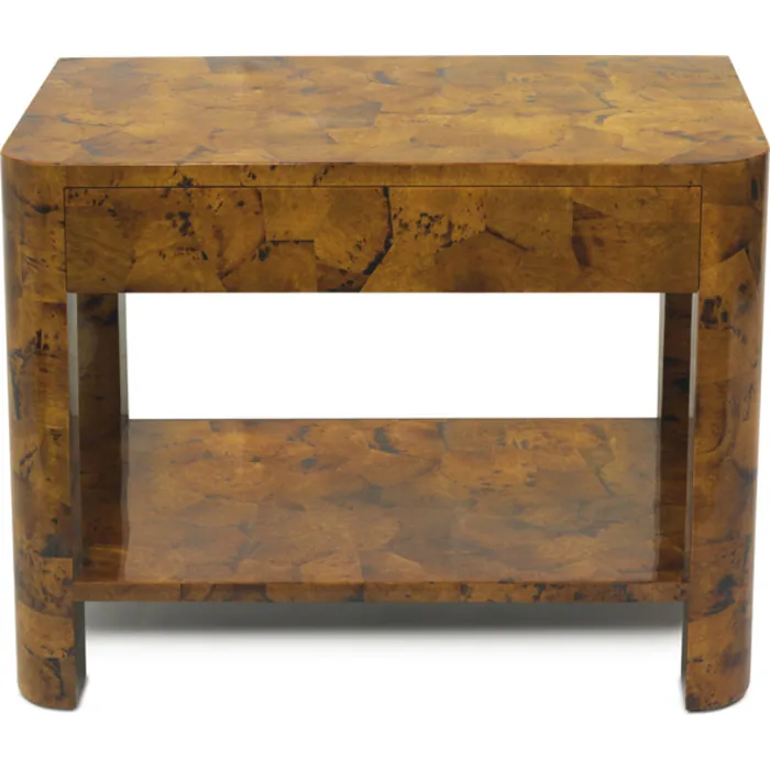 A nightstand that is both beautiful and functional! With a roomy shelf for books and "things," the drawer opens to reveal two sections. One has a sliding tray for a glass of water or a cup of tea. No more ugly stains on the top of your nightstand! Veneered with fossilized stone by expert artisans in the Philippines, "Cleo" is the perfect nightstand. Also available in custom sizes and finishes.