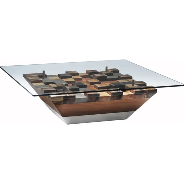 Geometric forms made from a variety of woods and stainless steel make a very unusual base for a glass top. Designed by Ramir Bonghanoy.