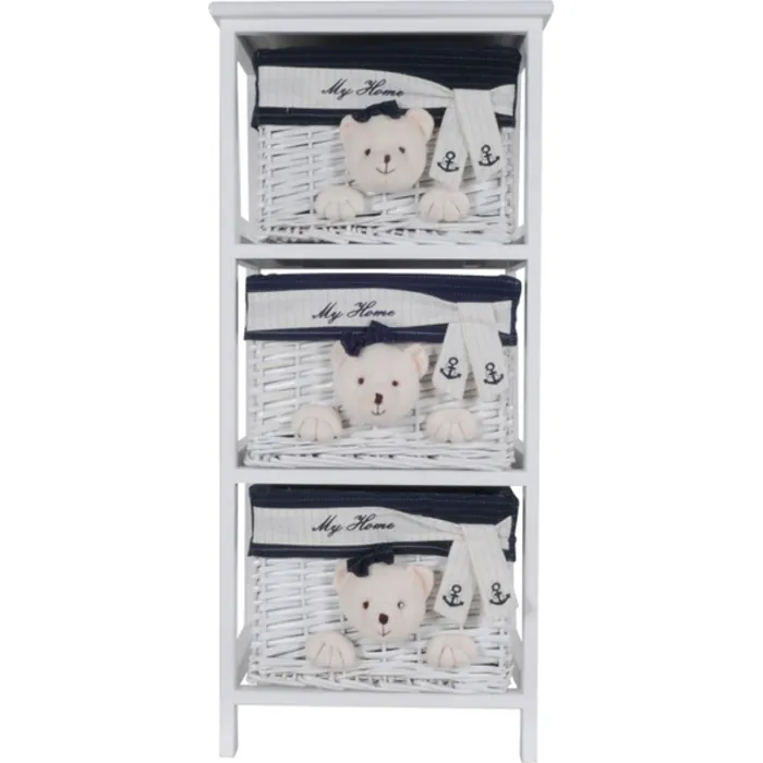 The portable three drawers would liven up a room with its sleek design. It has a clean white color with bears on the front of the drawers. This collection of drawers will have many things well-kept and organized. This item would be superb for children with many toys. Features: Stand: 16 x 12.5 x 35.5"es Dimension Per Drawer: 12 x 10 x 9"es
