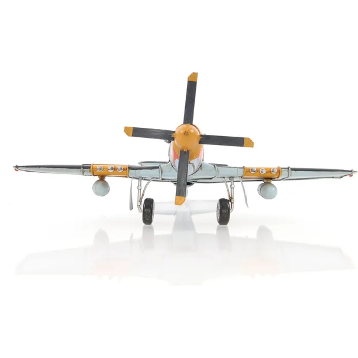 This 1943 Grey Mustang P-51 was an American long-range, single-seat fighter and fighter-bomber used during World War II, the Korean War and other conflicts. This replica model is handcrafted in iron frame with a scale of 1:40. This Grey Mustang P-51 model comes with remarkable details such as a propeller, wings, cockpit, and landing wheels. They are beautifully painted with the authentic WWII paint and symbols. A must have for the collector and enthusiast! • 100% iron frame • Metal wheels • Metal propeller • Wheels roll • Propellers spin • Decaled insignia • Landing gear, drop fuel tank, bomb, and missiles are securely welded on
