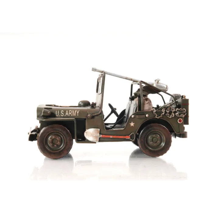 Drive back in time with this iconic 1940 Willy Overland Jeep from the World War II era. Handcrafted of iron with a scale of 1:12. This Jeep model comes with fine details such as wheels, hood, headlights, fenders, and machine gun. A must have for the collector and enthusiast! • 100% iron frame • Metal wheels • Wheels roll • Decaled insignia • Includes seats, steering wheel, stick shift, and small details on dash • Exterior details such as the guns and shovel are securely welded on • Sandbag in the back make out of canvas material for more authentic look