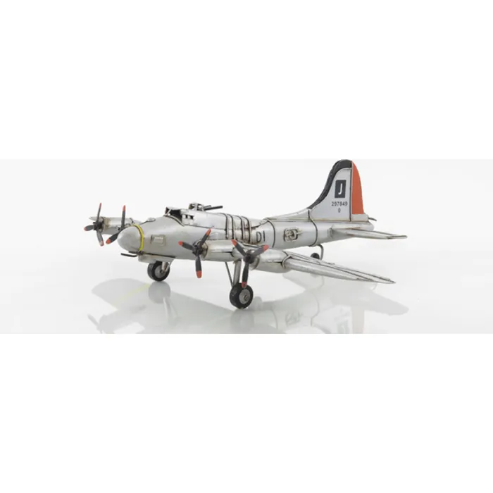 Hoisting a deadly load of bombs into the frozen skies, the B-17 Flying Fortress was the United States' workhorse heavy bomber during the WWII. This replica model is handcrafted in iron frame. The model comes with remarkable details such as front rotor blade, wings, cockpit, and landing wheels. They are beautifully painted with the authentic WWII paint and symbols. A must have for the collector and enthusiast! • 100% iron frame • Wheels roll • Metal propeller • Decaled insignia