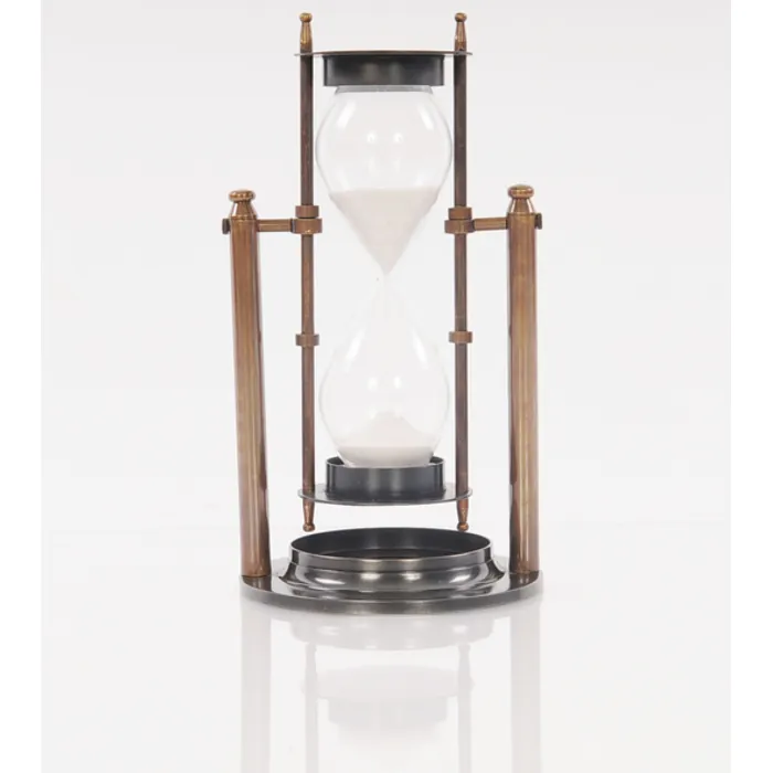 The sand timer, more commonly referred to as the hourglass, is a device used to keep track of time. Minutes are measured as sand moves from bulb to bulb. During a voyage, the hour glass would be one of few reliable ways to measure time at sea alongside a compass to assist overall navigation. This brass, invertible hourglass stands on a metal base, navigating us through our days. • Made out of brass with a two-tone antique finish • Revolving sand timer • The sand flow duration is approximately 2 minute and 45 seconds.
