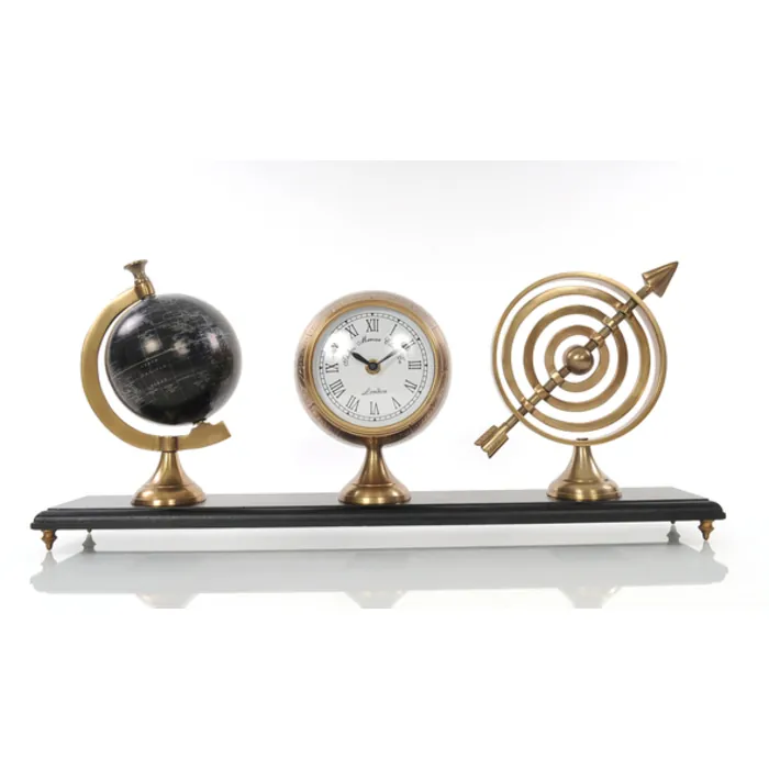 A collection of nostalgic brass memorabilia all on one platform! This set comes with a classy vintage globe, an engraved 19th century inspired clock, and a basic armillary sphere. This piece is a perfect gift for him or any navigators in your life. • Clock uses one AA 1.5V battery (battery not included) • Armillary rotates and globe spins at poles • Base made out of dark wood with a felt lining on the bottom • Globe, armillary, and clock made of aluminum with a brass finish