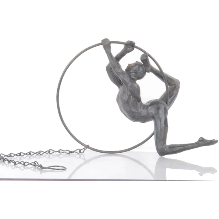 A ring man represents ultimate strength and flexibility. This decorative piece is best hung from the ceiling or at a higher point to showcase the essence of athleticism. This piece is all black with some copper touches for a realistic look. This would make a great addition anywhere in your home or office with its subtleness.