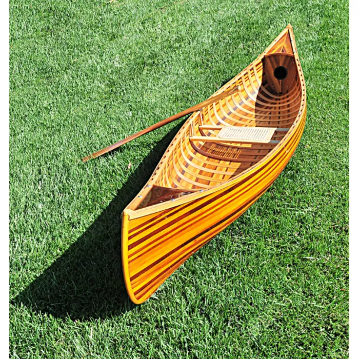 Here is where you see what handcrafted looks like. Here is where you see how carefully hand joined cedar strips encapsulated in fiberglass epoxy can create the ultimate water vessel. And here is where history comes alive in the details of the ribs, the hull and even the paddle. A display piece extraordinaire, this canoe will perfectly complement any room, any staging area or anywhere else you can think of to place this artistic masterpiece. For those who truly appreciate the work of artisans and the pride of craftsmanship, this display canoe is the only one for you. Features - Stunning beautiful clear graded cedar hull. - Fiberglass adds important tensile strength and abrasion resistance to the wood. - 100% western red cedar make our boats surprisingly light weight. - Ribs make our canoe stronger and prettier. - Paddle is included Boat Dim: L 118.5", W: 26.25", and bow height: 16". Mid Height:8"es. Weight: 27lbs