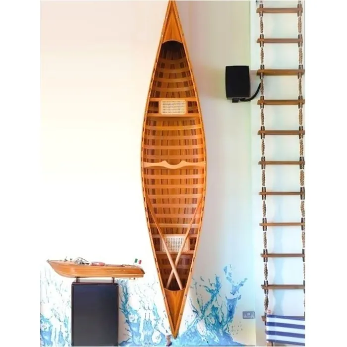 Enjoy the day, get lost in your weekend as you canoe out on the lake or stream with this amazing vessel. Beauty and function combine to make this an incredible canoeing experience for the beginner or expert alike. Requiring over 400 hours build time, this demonstrates years of boat making ability and prideful tradition. Each cedar strip is hand selected and hand joined and then encapsulated in fiberglass epoxy to give you the ultimate boating experience. The moments we spend enjoying our life, as on the water, are often too few and far between. You want to make sure that the experiences are memorable and truly one-of-a-kind. With this canoe they will be! This canoe measured as follow: * Length: 144", Width: 28.5" * Bow Height: 21(inches). * Mid Height: 10(inches). * Weight: Appr 35lbs. * Rocker: Slightly rocked * Capacity: 375lbs Features - Stunning beautiful clear graded cedar hull - Fiberglass adds important tensile strength and abrasion resistance to the wood - 100% western red cedar make our boats surprisingly light weight that one person can carry - Curved bow - Come with a show graded set of wooden paddles.