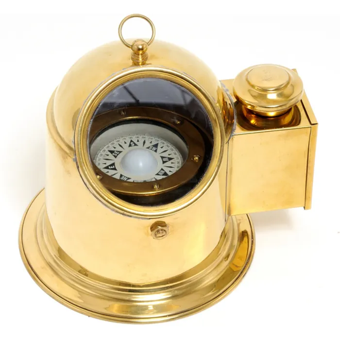 This is a functional large Binnacle compass that was used to hold a ships magnetic compass. It is made of solid brass tinted with a golden glow. A floating dial compass is securely fitted inside which can be seen through the glass window. There is also a display oil lamp on the side of the compass used to light up the compass at night. It is a great addition to any nautical collection. The item dimensions are L: 9"es, W: 7.25"es, H: 7"es.