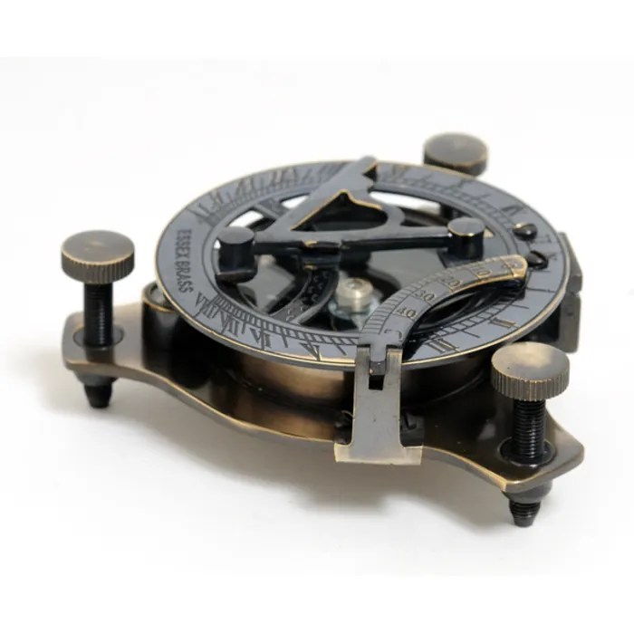 This is a fully functional sundial compass. It is made from high quality brass. Each component is crafted with the finest craftsmanship. It contains a foot screw and circular bubble for easy reading. The lid is fixed with a hinge. Available in antique brass finish and come with a beautiful rosewood gift box. This compass is a great addition to any nautical collection. The item dimensions are: L: 3.25"es, W: 3.25"es, H: 3.25"es.