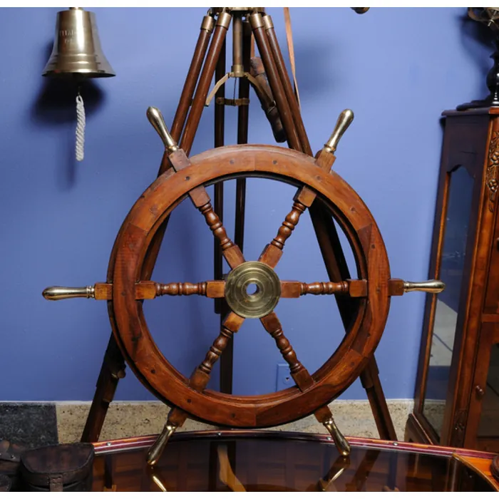 This 30" ship wheel is made from the finest quality of rosewood. Its center is fitted with a golden brass hub. The ship wheel comes with brass handles. These brass handles show that it originally belonged to a high ranking naval ship. It is a beautiful piece that would be perfect for the home, office, or even on your own boat. It comes in a natural shiny wood finish. The item dimensions are: L: 30"es, W: 30"es, H: 2"es.