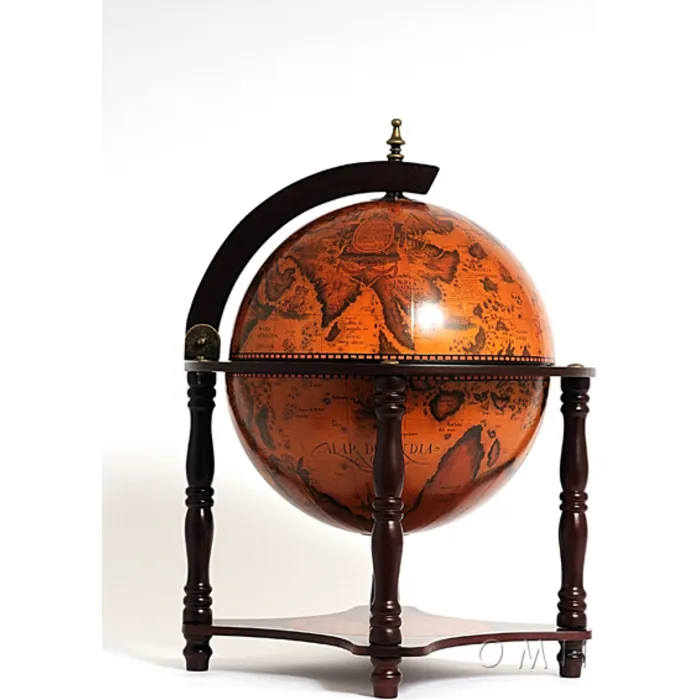 Featuring an old nautical map on its surface, the globe can be lifted to reveal the hidden drink cabinet and the highly decorated interior. This mini-bar is made of wood and painted in dark red mahogany. Globe Diameter : 13inches. Overall Dimension: 17x17x22H. Come with complete assembly instruction.