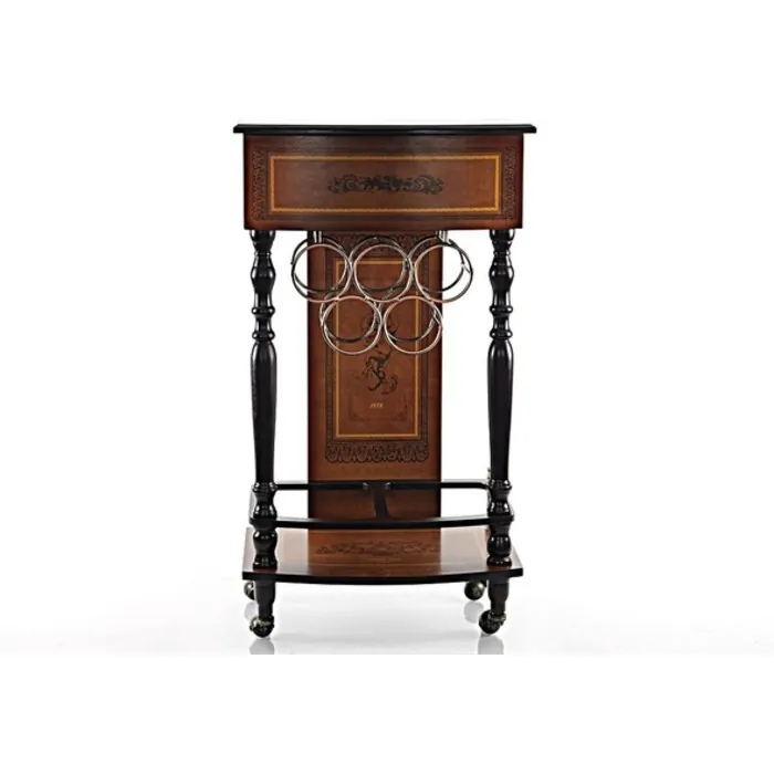 Add a touch of elegance to your bar area or dining room this stylish wine cabinet. This nautical vintage styled, elegant, wine cabinet fits 5 bottles of wine on the bottom rack and you can further store wine glasses on the sleek storage cabinet drawer on top, equipped with four legs and wheels for home, office, or wherever you would like to receive guests in a classy manner. Whether it is open or closed this cabinet is a highlight to any room. Features: Overall dimension: 20" W x 14" D x 36" H Vintage finish 4 casters for easy relocation Holds up to 5 bottles of wine Wood and MDF construction Assembly required