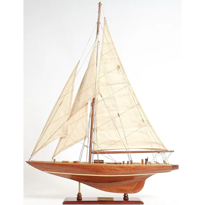 Our Enterprise Yacht model is scratched built plank on frame by skillful and creative master craftsmen. Strip by strip of mahogany and teak were put together. It was built according to scale through original plans, pictures, and drawings. The hull is truly beautiful; It was carefully put together using the best material to create a smooth surface on both sides. On the yacht, you can easily locate gorgeous wooden parts and ornaments such as wooden mast, wooden boom, wooden bunkers, front and main sails with detailed stitching, wooden pole and metal steering, metal railing, and much more. We only use high-quality wood and metal to build the model, absolutely no plastic parts. This beautiful model is rested on a painted solid wooden stand. To enhanced value and recognition, a shiny metal plate embedded with “Enterprise 1930” is provided. This model is fully assembled and ready for display when it arrives at your home!