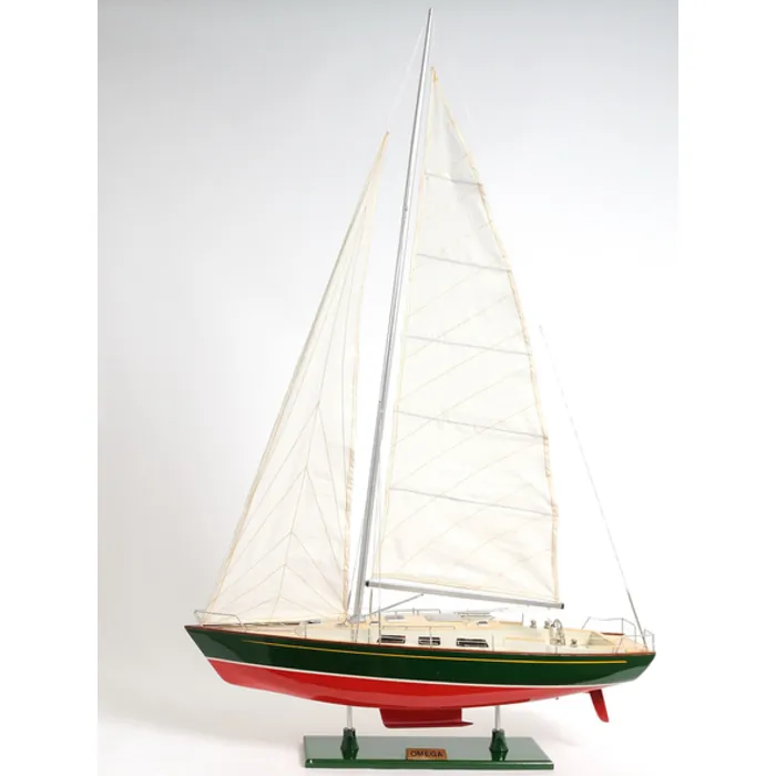 The Omega 46 is one of the most beautiful yachts on the water. The spacious interior has two large double rooms, one in the front, and one in the rear. Now you can have it displayed right into your own room or office. Master craftsmen handcraft these highly detailed wood models from scratch using historical photographs, drawings and original plan. They are built to scale with high-grade wood such as: western red cedar, rosewood, and mahogany. They are 100% hand built individually using plank-on-frame construction method and are similar to the building of actual ships. Each model requires hundreds of hours to finish and must go through a demanding quality control process before leaving the workshop. The Omega 46’s hull is painted beautifully in red and green with white waterline. The mast, boom and boom vang are painted in silver. The sails are meticulously stitched that extends all the way to the masthead. The model exhibits a double deck made out of wood from the inside cabin to the gunwale. Metal stanchions hold up the guardrails in place around the deck. There are also numerous details on the deck such as hatches, winches, metal steering wheel, cabin and companion way. The model is secured tightly on a painted wood base with a brass nameplate. It’ll make a perfect gift for home or office decorator, boat enthusiast, or passionate collector.