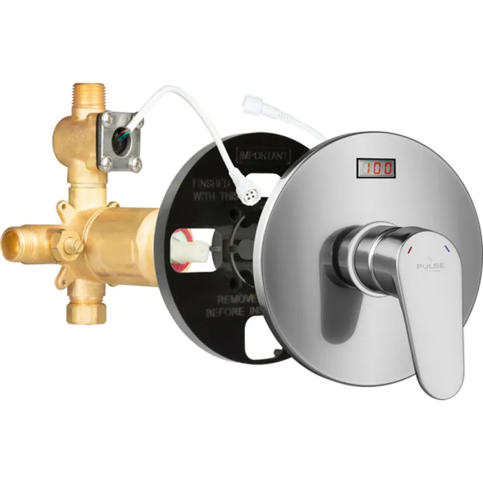PULSE ShowerSpas Tru-Temp Pressure Balanced Rough-In Valve with Trim Kit comes in three beautiful finishes and compliments any PULSE retrofit shower system. This valve utilizes a pressure balancing mixing cartridge to ensure constant water temperature in response to changes in water pressure (e.g. flushing a toilet). The valve also comes equipped with an adjustable Hot Limit Safety Stop to reduce risk of scalding along with a water power generated LED temperature display to assure your desired temperature every time. The Plaster Guard is to be used as a guide, making installation easier than ever!