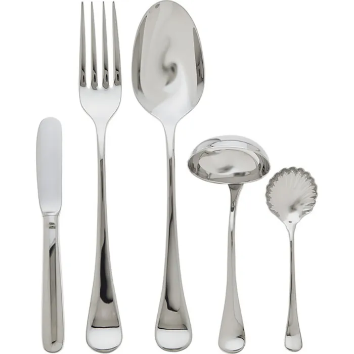 - Set includes butter spreader, serving fork, spoon, ladle and sugar spoon
