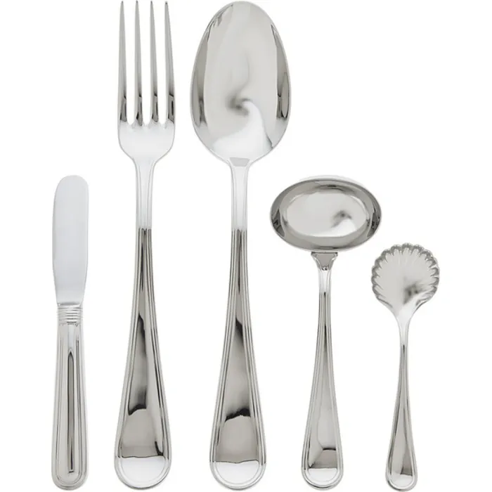 - Set includes butter spreader, serving fork, spoon, ladle and sugar spoon