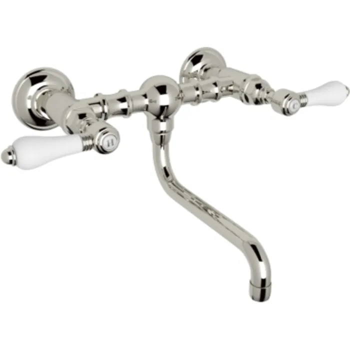 ROHL ITALIAN BATH VOCCA WALL MOUNTED BRIDGE LAVATORY FAUCET IN POLISHED NICKEL WITH PORCELAIN LEVERS AND LOW SWINGING SPOUT