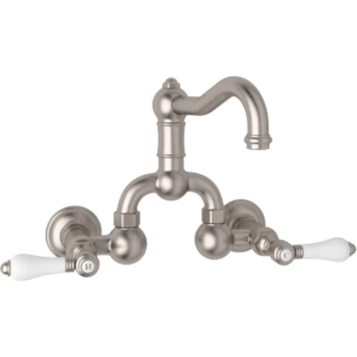 ROHL ITALIAN BATH ACQUI WALL MOUNT LAVATORY BRIDGE FAUCET IN SATIN NICKEL WITH PORCELAIN LEVERS POP-UP AND COLUMN SPOUT