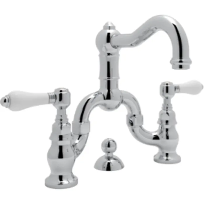 ROHL ITALIAN BATH ACQUI DECK MOUNTED LAVATORY BRIDGE FAUCET IN POLISHED CHROME WITH PORCELAIN LEVERS POP-UP AND COLUMN SPOUT