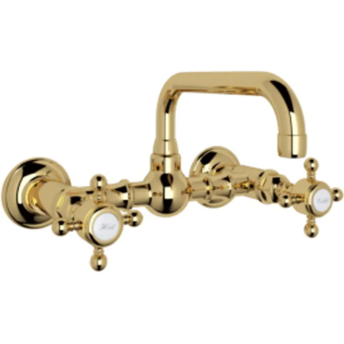 ROHL ITALIAN BATH VOCCA WALL MOUNTED BRIDGE LAVATORY FAUCET IN ITALIAN BRASS WITH CROSS HANDLES AND HIGH SWINGING SPOUT