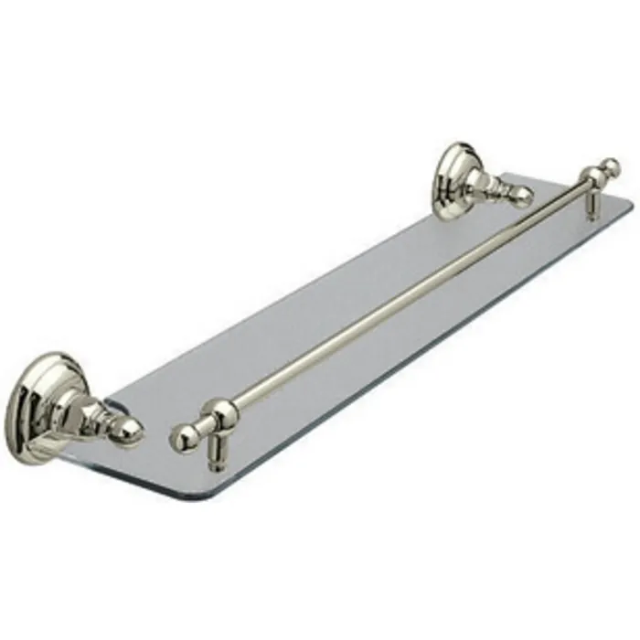 ROHL ITALIAN BATH WALL MOUNTED 24^ WIDE GLASS VANITY SHELF WITH FRONT RETAINING RAIL IN SATIN NICKEL