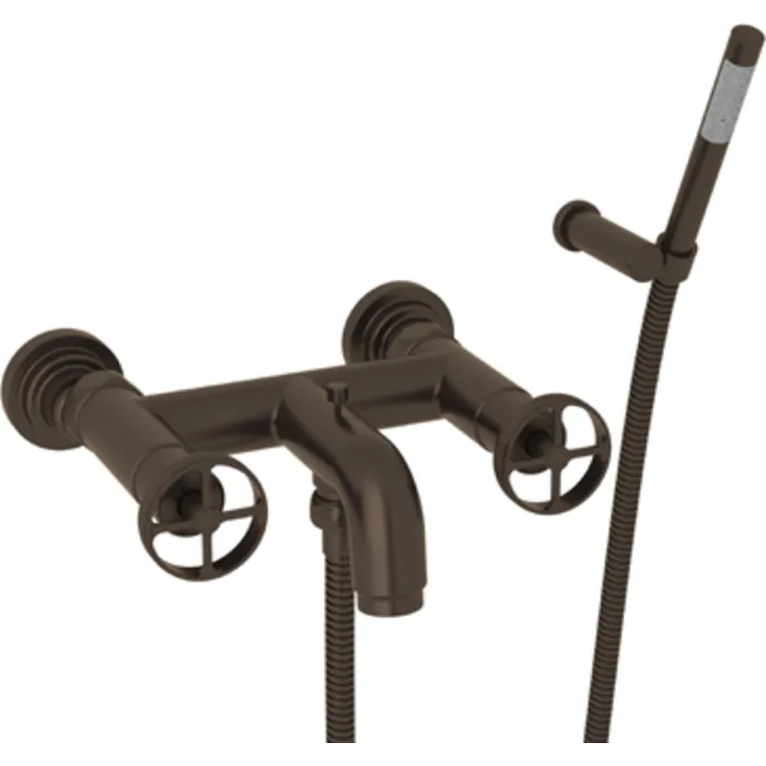 Rohl Campo Wall Mount Tub Filler With Handshower And Wheel Handles In Tuscan Brass A3302IWTCB