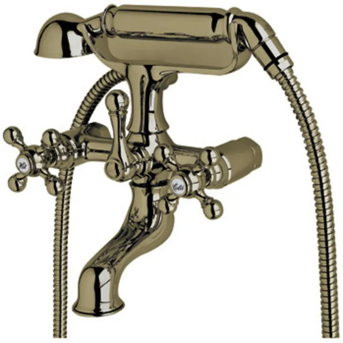 CISAL EXPOSED TUB FILLER MIXER WITHOUT UNIONS IN TUSCAN BRASS WITH CROSS HANDLES AND METAL HANDSHOWER WITH HOSE