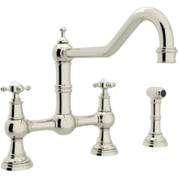Rohl Perrin & Rowe Edwardian Era Cross Handle Bridge Kitchen Faucet With Sidespray Rinse In Polished Nickel With 11 inch Extended Reach Spout U.4763X-PN-2