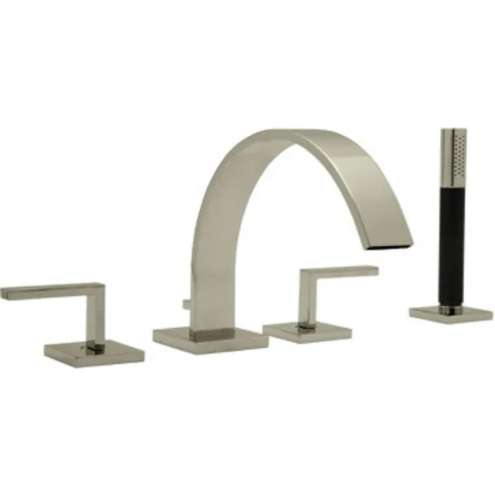 ROHL CISAL WAVE FOUR HOLE DECK MOUNTED TUB FILLER WITH LEVER HANDLES 3/4^ VALVES 8 27/32^ REACH SPOUT AND HANDSHOWER IN SATIN NICKEL