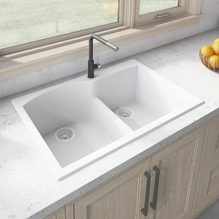 Constructed of composite granite - 80% crushed natural granite for extreme durability and strength. The remaining 20% is a proprietary resin that makes the sink completely non-porous and resistant to most household chemicals.