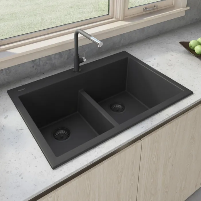 Ruvati 33 x 22 inch epiGranite Drop-in TopMount Granite Composite Double Bowl Low Divide Kitchen Sink - Midnight Black - RVG1385BK