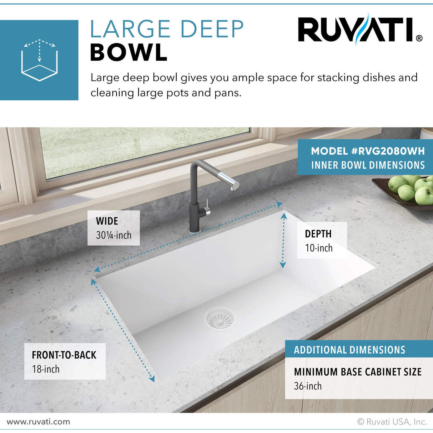 10" deep bowl gives ample space and fits large pots and pans