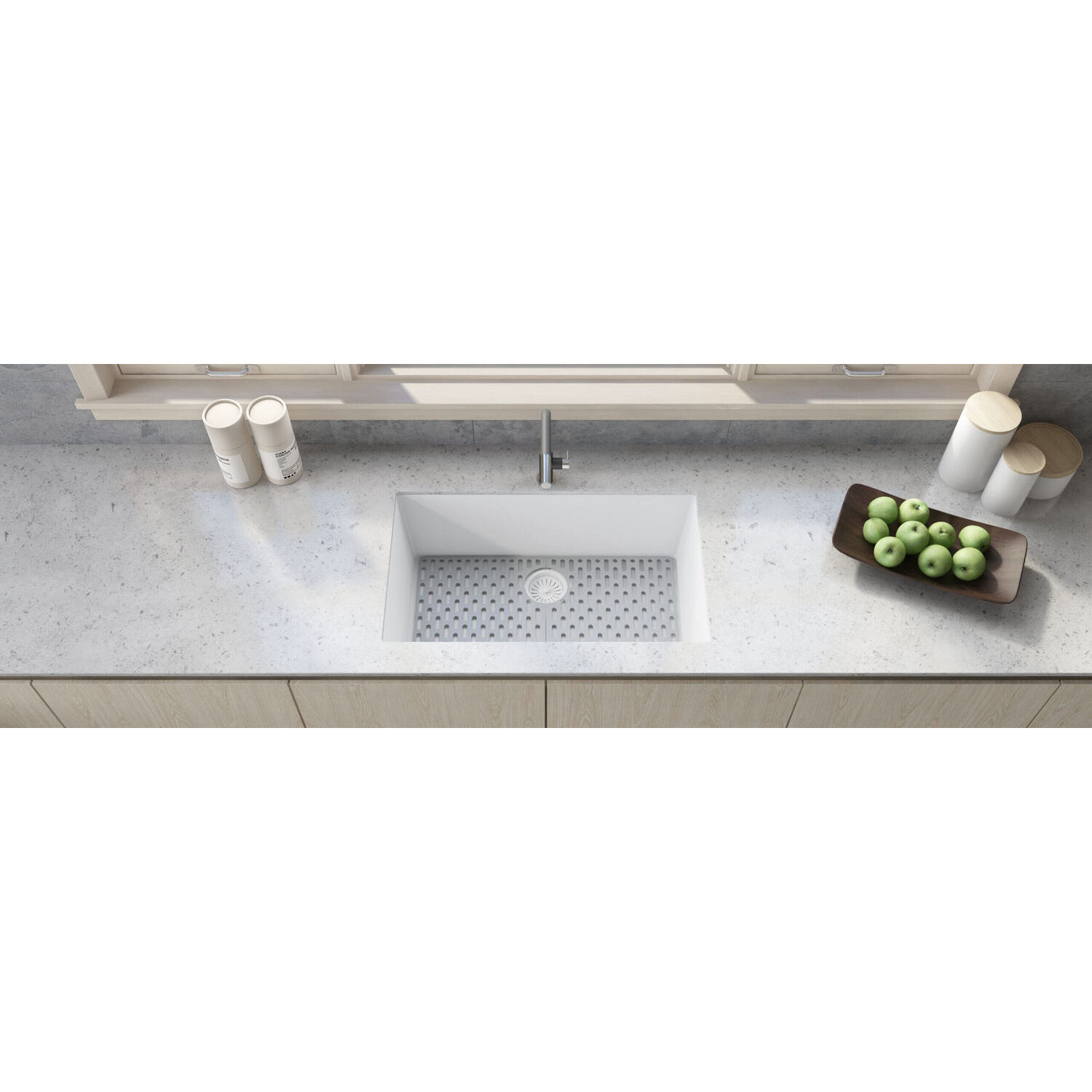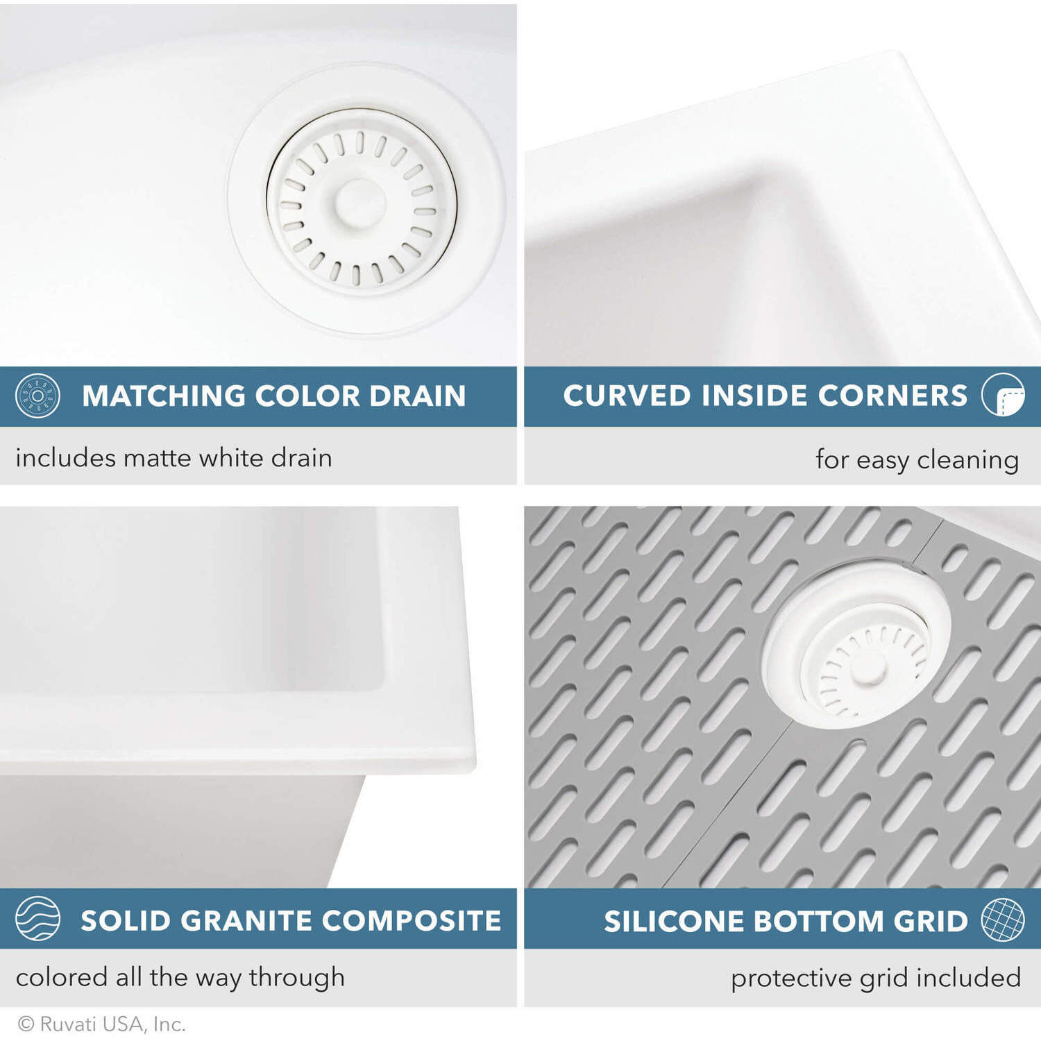 The sink is colored all the way through, for a rich and consistent look that will never discolor. Thick solid construction makes the sink naturally sound-absorbing and noise free.