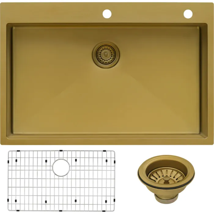 - Satin Brass Matte Gold finish - Gold or Brass colored hardware is now a very trendy kitchen style. Now you can add a brass-tone sink to match your brass-tone pendant lights and cabinet handles.
