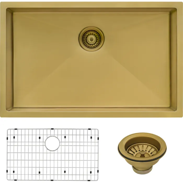 - Satin Brass Matte Gold finish - Gold or Brass colored hardware is now a very trendy kitchen style. Now you can add a brass-tone sink to match your brass-tone pendant lights and cabinet handles.