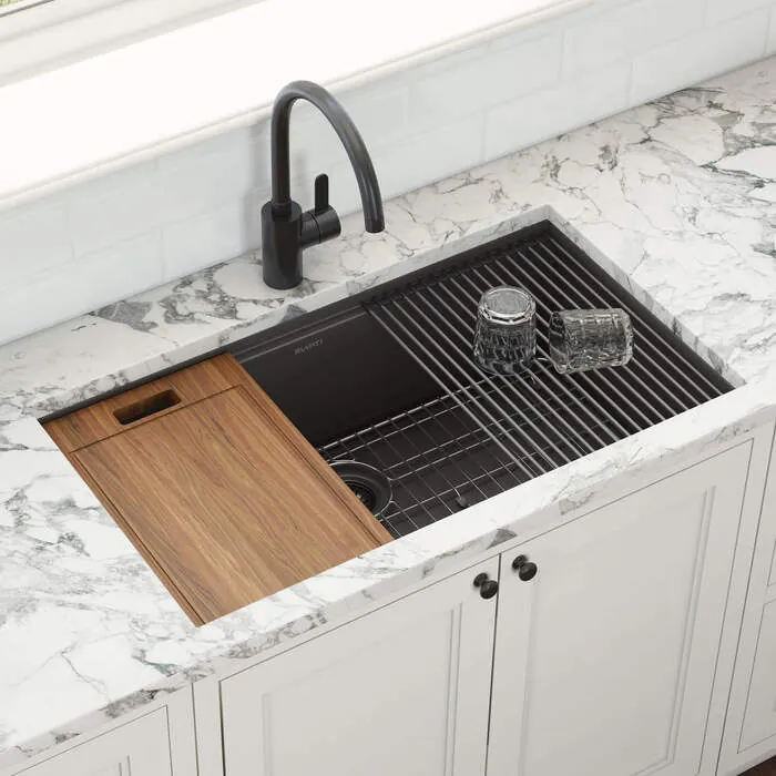 - INCLUDED IN BOX: Sink, solid wood cutting board, matching roll-up drying rack, matching color basket strainer drain assembly, stainless steel bottom rinse grid, installation guide.