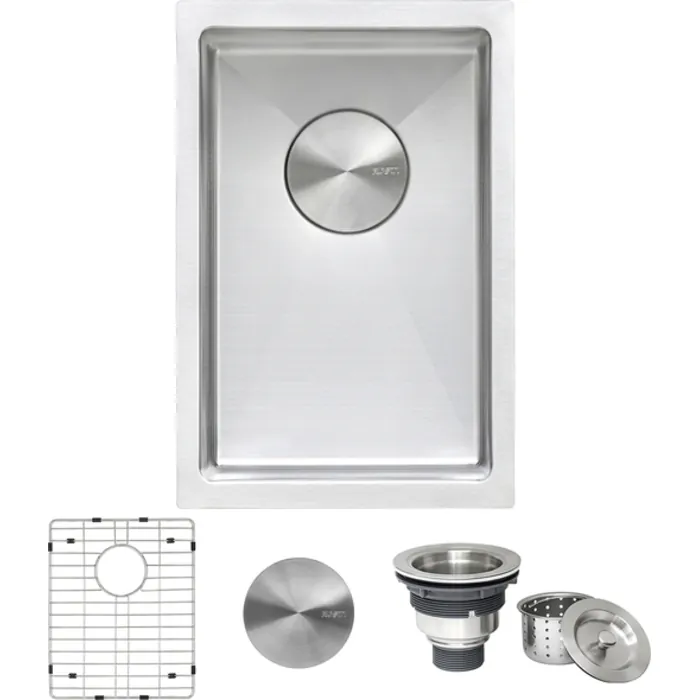 - Included in box: Sink, rinse grid, basket strainer drain assembly, decorative drain cover, cut-out template, mounting brackets.