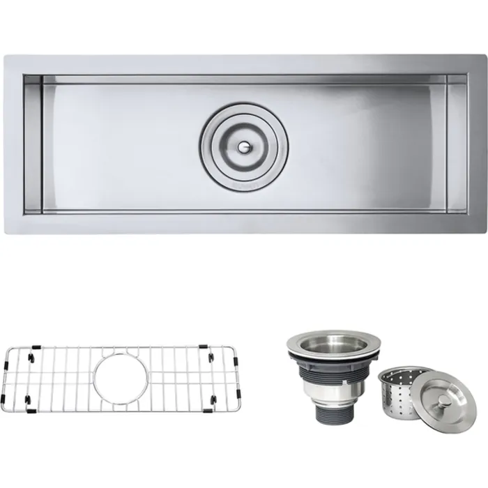- Included in box: Sink, cut-out template, mounting brackets, rinse grid, basket strainer