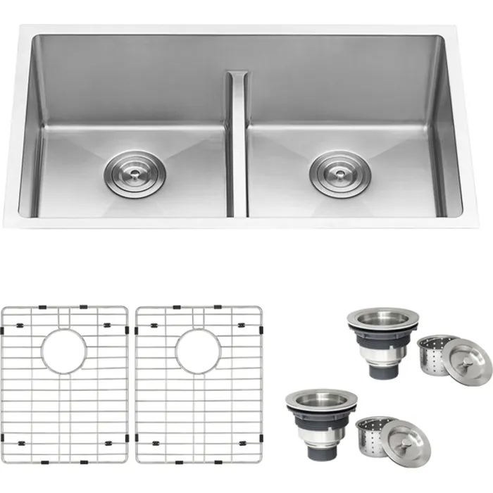 - Included in box: Sink, cut-out template, mounting brackets, rinse grids (set of 2), 2 basket strainers