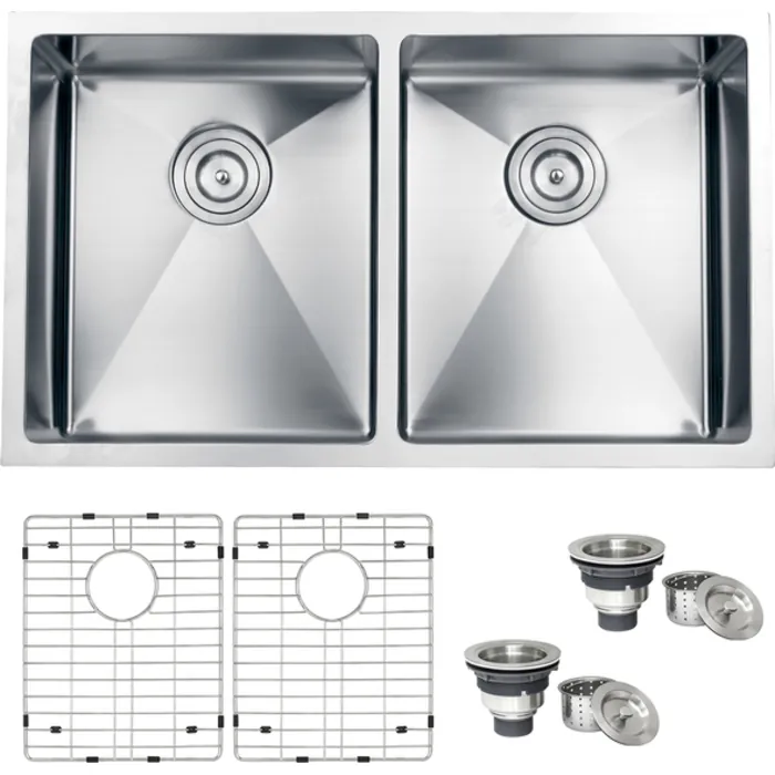 - Included in box: Sink, cut-out template, mounting brackets, rinse grids (set of 2), 2 basket strainers