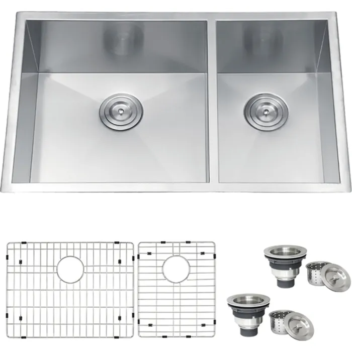 - Included in box: Sink, cut-out template, mounting brackets, rinse grids (set of 2), 2 basket strainers