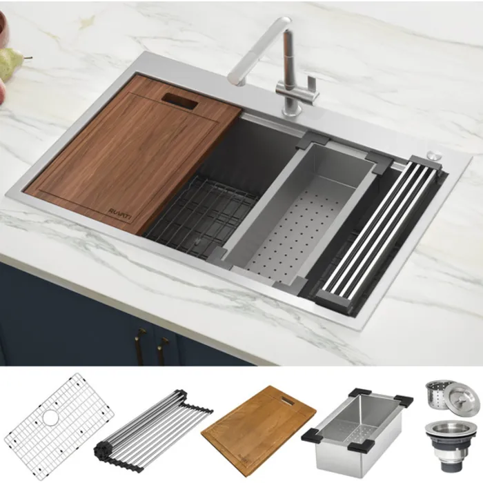 This WORKstation sink from Ruvati's Tirana series combines a solid top-mount rim with a functional workstation: built-in accessories (colander, cutting board and roll-up rack) that slide on the integrated tracks in the sink. Includes a deep stainless steel colander that you can use as strainer. The solid hardwood cutting board is constructed of Sapele wood - a luxurious wood that has a beautiful finish and handles water well. The roll-up rack, made of stainless bars held together with flexible silicone, rolls out on the track and is ideal as a dish drying rack. The sink features a 1-inch wide and 1/4-inch high rim all around that sits topmount on your countertop. The sink comes in a standard 33-inch by 22-inch dimension, so it will fit in most existing cutouts from your old overmount sink. Ruvati's Tirana workstation turns your sink into a complete work space - you can do all your prep work right on top of your sink, and keep your countertops clean and free of mess.
