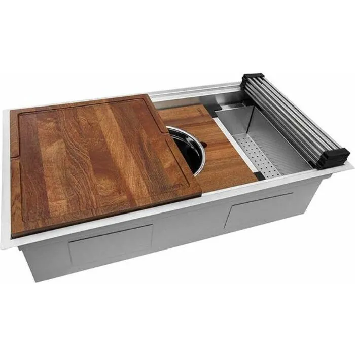 Ruvati takes kitchen functionality to a whole new level with this 45" long workstation sink that converts your kitchen sink to a full-fledged work space. The sink comes with an array of built-in accessories and two tiered tracks on the front and back for the accessories to slide on. Both the included cutting boards will fit on either top or lower track, so you can slide one on top of the other. The cutting boards are flat on one side, but when flipped, convert into a tray with raised edges. When you need more countertop space, the two cutting boards placed side by side on the top or lower track will cover almost your entire sink. Now you can use all that extra space for food-prep, or for entertaining guests by turning the cutting boards over into trays and placing plates, cups or serving dishes on them. The reversible cutting boards are constructed of sapele wood (African Mahogany) - a luxurious hardwood that has a beautiful finish and handles water well. Also included with the workstation sink are two stainless steel colanders - one deep and one shallow that slide on the lower track. The roll-up rack fits on the top track and is ideal as a dish drying rack. It is constructed of stainless steel bars and a flexible silicone frame allowing you to fold it to the right size or roll it up tightly for storage when not in use. Two stainless steel rinse grids sit on the bottom of the sink and covers the entire bottom of the sink bowl. The grids protect the sink bottom during daily use, and allows you to dry dishes or large pots and pans. The large size of the sink means you can easily install two kitchen faucets with it, allowing two people to work at the same time. The 10" deep bowl gives you plenty of space in the sink. The bottom of the sink is engineered for perfect water drainage. It features a 1" slope from one end of the sink to the drain. The sink is reversible so it can be installed with the drain on left side or right side. With the extra large size and all the built-in accessories, the Ruvati Workstation sink truly redefines your kitchen space and experience.