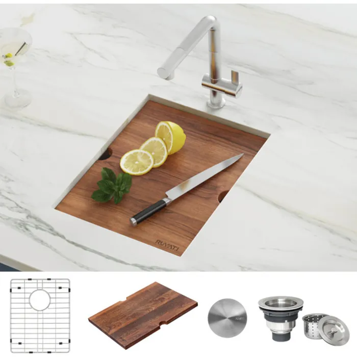 Workstation sink: Ledges on the front and back provide a track for the included cutting board