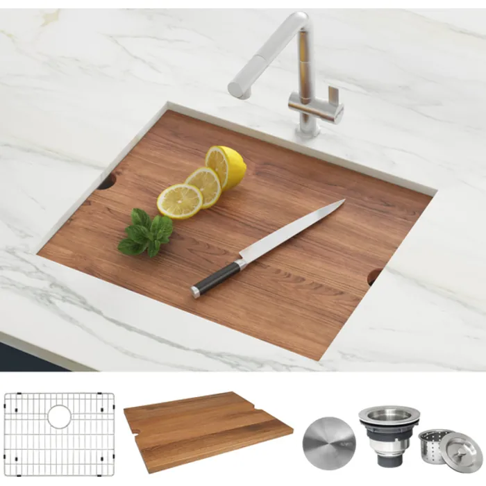 - Included in box: Sink, rinse grid, stainless steel colander, wood cutting board, basket strainer, cut-out template and mounting brackets